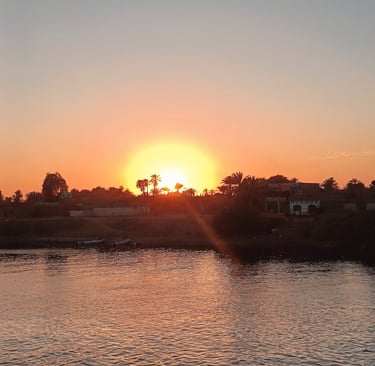 Los atardeceres en el Nilo son pura magia. El cielo se tiñe de tonos dorados y anaranjados mientras el río refleja la luz como un espejo infinito. Las palmeras se recortan en el horizonte y el silencio se mezcla con el murmullo del agua. Es un momento en el que el tiempo parece detenerse, perfecto para dejarse llevar por la paz y la belleza de Egipto.