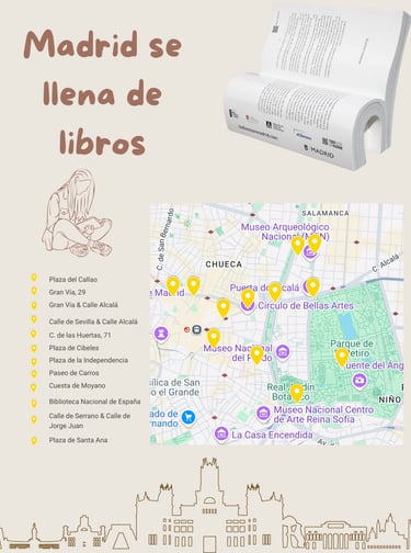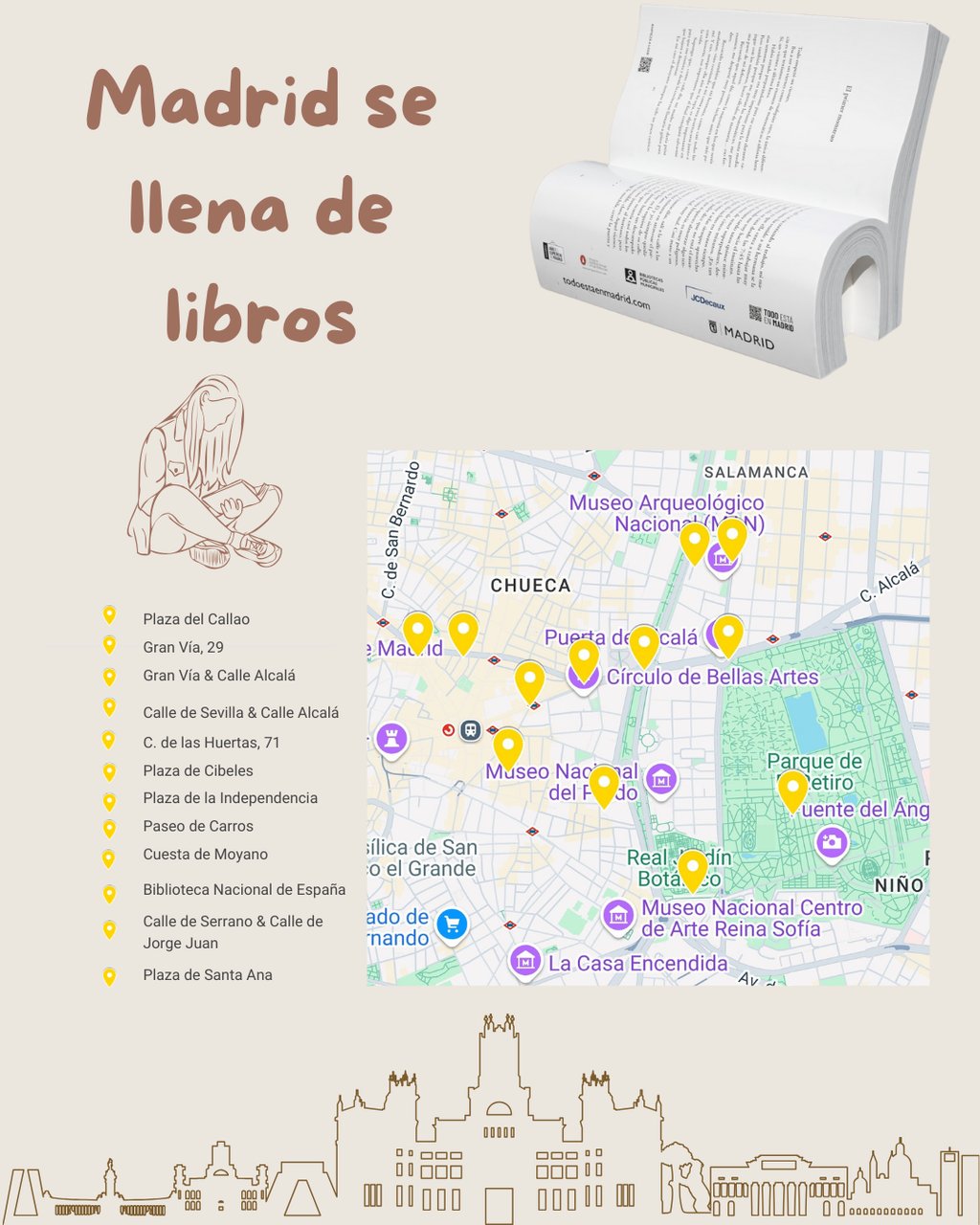 Con motivo de la Feria del Libro de Madrid, sus calles se llenarán desde el 23 de Mayo al 22 de Junio de bancos con forma de libro. Aquí os dejo algunos que podréis ver si paseáis por esta maravillosa ciudad.